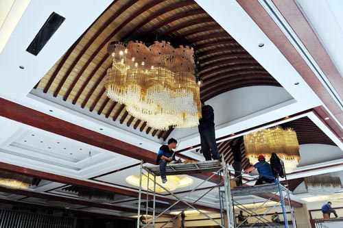 (1)施工前應了解燈具的形式(定型產品、組裝式)、大小、連接構造,以便確定埋件位置和開口位置大小。質量大的吸頂燈要單獨埋吊筋,不可用射釘后補吊筋。