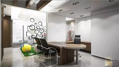 接下來看到經(jīng)理辦公室,利用圓點圖案進行隔斷,小面積的亮色地毯裝飾,讓沉悶的辦公室一下就活躍起來,讓人眼前一亮。這樣的簡約辦公室裝修風格整體很自然,不用刻意地去修飾。